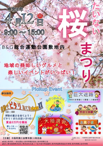 たいない桜まつりのお知らせ 公開:2026年3月3日 🌸胎内桜まつりのお知らせ ● とき 2026年4月12日(日) 9:00~15:00 ● ところ B&G総合運動公園 敷地内 地域の美味しいグルメと、楽しいイベントが盛りだくさん! 🎪 ピックアップイベント ・米粉でピタリあてまSHOW!(12:00~) 米粉の重さを当てよう! ピタリ賞、または最も近い方1名に 賞金3万円 を贈呈。 ・魚のつかみどり ・豪華景品多数!ガラポン大抽選会 ・巨大迷路(B&G大体育館にて開催・入場無料) ・芋ほり体験 ・お菓子まき